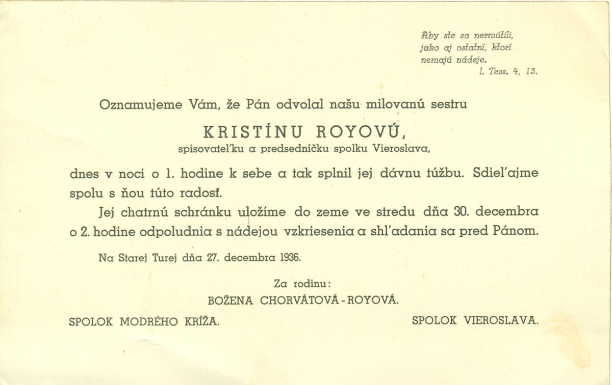 Práve dnes sme si pripomenuli jej odchod do večnosti. Zároveň sa dostávame k prahu nového roka, v ktorom si pripomenieme okrúhle 90. výročie smrti Kristíny Royovej. Pre naše múzeum a určite aj Evanjelickú cirkev a. v. príp. Cirkev bratskú, pre naše mesto, pre Staroturiansky okrášľovací spolok a ďalších, je dôležité, v akom stave sa nachádzajú hroby sestier Royových či ich významných spolupracovníkov. Skúsme v rámci možností upraviť tieto miesta do dôstojnej podoby, ktorá odzrkadlí náš vzťah k týmto osobnostiam. Tak ako to bolo v prípade staroturianskej židovskej komunity, aj sestry Royové spolu s diakonkami zostali bez potomkov, ktorí by sa dnes o hroby mohli postarať. Celý život totiž venovali službe núdznym a nikdy sa nevydali. Tieto hroby sú zároveň miestami, ktoré stále navštevujú obyvatelia Starej Turej, rôzne zájazdy i cestujúci zo zahraničia. Sami ich častokrát sprevádzame.